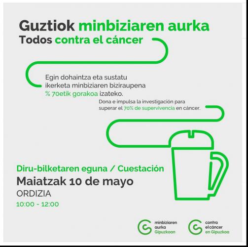 Minbiziaren ikerketa sustazen lagundu nahi diguzu? Zure laguntzari esker, gaixotasunaren biziraupenaren %70a lortu dezakegu 2030. urterako. Datorren asteazkenean, maiatzak 10, Ordiziako kaleetara irtengo gara gure urteroko diru-bilketan, dohaintzak biltzeko eta, horrela, helburu horiek lortzeko. Zure laguntza funtsezkoa da!