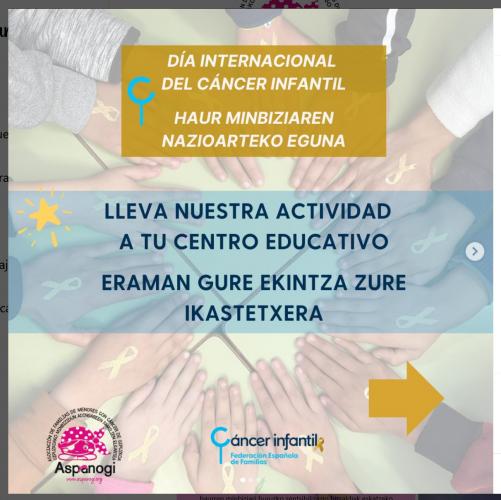 Otsailaren 15a Haur Minbiziaren Nazioarteko Eguna da, eta @familiascancerinfantil, osatzen dugun elkarte guztiekin batera, jarduera bat prestatu dugu hala nahi duten ikastetxe guztientzat.