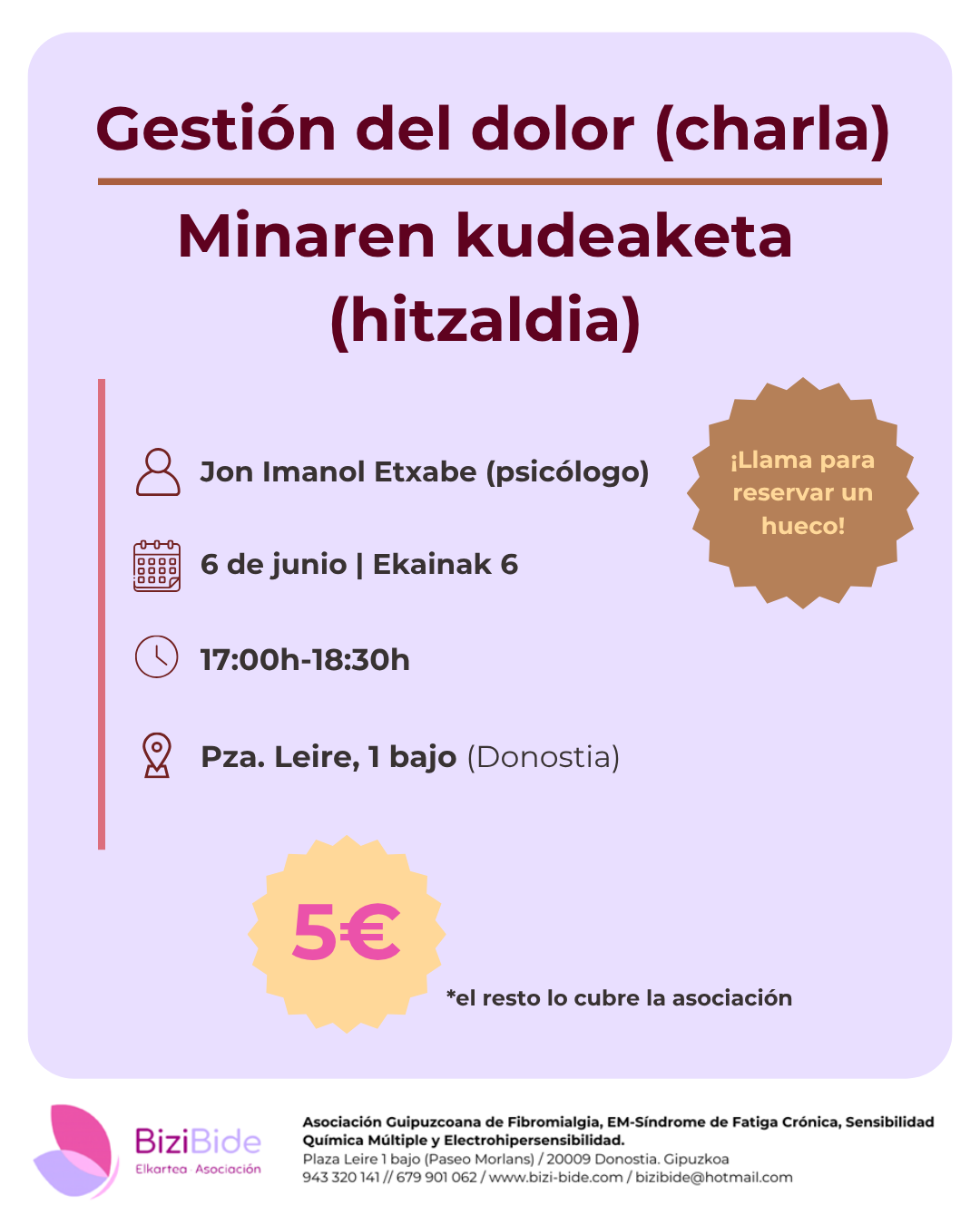 Ekainaren 6an, Bizi Bide elkarteko Jon Imanol Etxabe psikologoak minaren kudeaketari buruzko hitzaldia emango du.