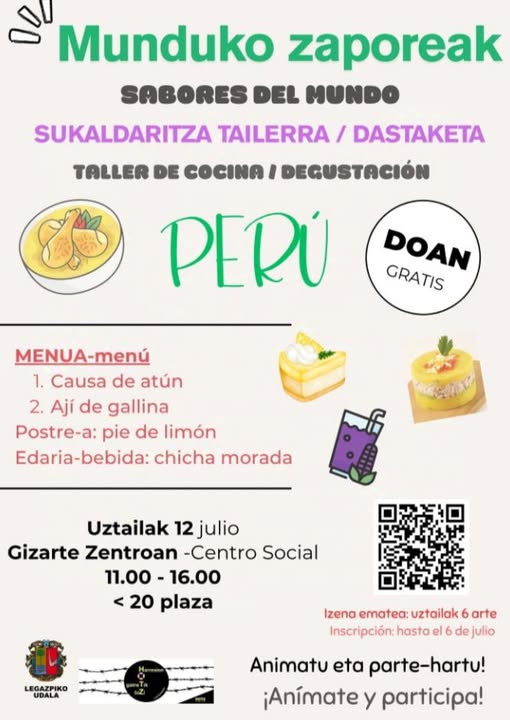 Proposamen horietako bat Peruko sukaldaritza tailerra da. Uztailaren 12an, larunbata, egingo da herriko gizarte etxean, 11:00etatik aurrera. Oraingo honetan, parte hartzaileek Peruko pla