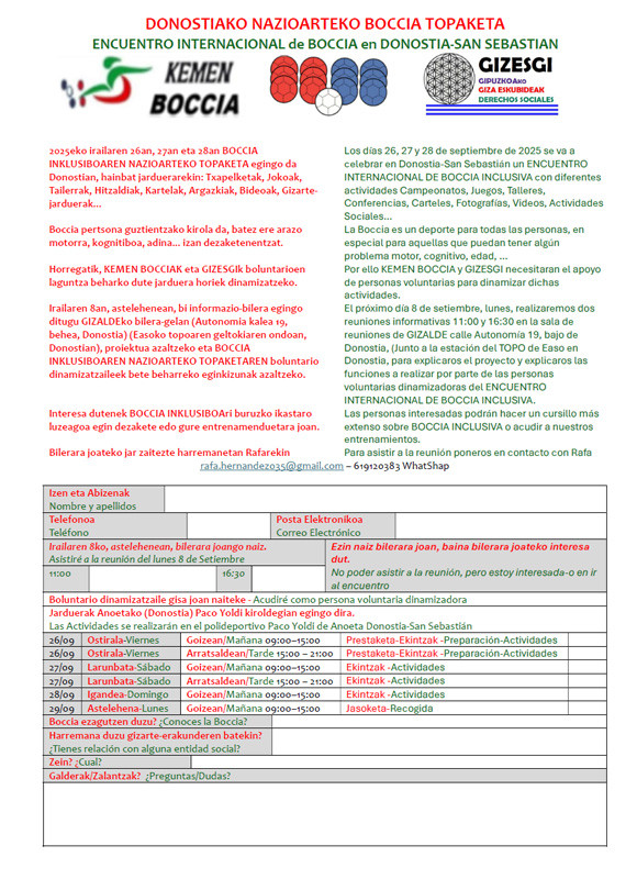 Irailaren 8an, astelehenean, bi informazio-bilera egingo ditugu GIZALDEko bilera-gelan (Autonomia kalea 19, behea, Donostia) (Easoko topoaren geltokiaren ondoan, Donostian), proiektua azaltzeko eta BOCCIA INKLUSIBOAREN NAZIOARTEKO TOPAKETAREN boluntario dinamizatzaileek bete beharreko eginkizunak azaltzeko.