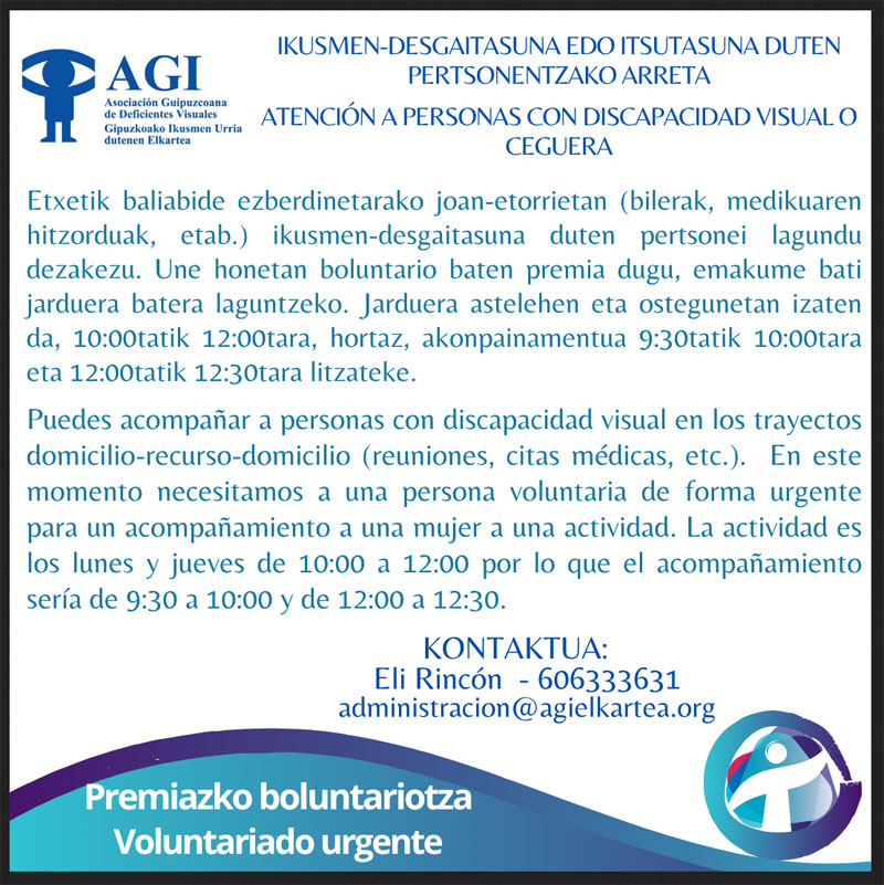 Etxetik baliabide exberdinetako joan-etorrietan (bilerak, medikuaren hitzorduak, etab..) ikusmen-desgaitasuna duten pertsonei lagundu dezakezu. Une honetan boluntario baten premia dugu, emakume bati jarduera batera laguntzeko.