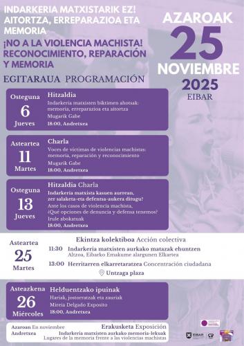 Eibarren azaroak 25, Emakumeen aurkako indarkeria ezabatzeko Nazioarteko Eguna dela eta antolatu diren ekitaldien egitaraua. Aurtengo leloa "Indarkeria matxistarik ez! Aitortza, erreparazioa eta memoria" da.