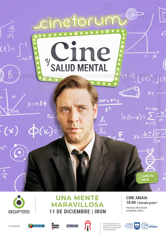 Agifesek Zinema eta Buru Osasuna zineforum saioa eskainiko du datorren abenduaren 11an, 19:00etan, Irungo Amaia kultur zentroan. Proiektatutako filma zinemako klasiko bat izango da: ‘Una mente maravillosa’, lau Oscar sari irabazi zituen drama biografikoa. John Nashen bizitza kontatzen du, Ekonomiako Nobel Saria eskuratu zuen matematikari bikainarena. Eskizofrenia paranoidearen diagnostikoa zuen.