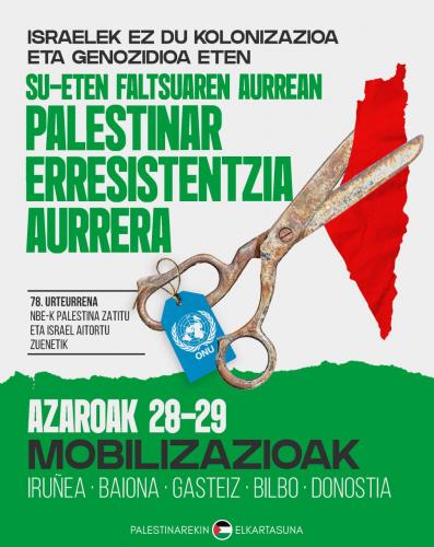 Palestinarekin Elkartasuna plataformak mobilizatzera deitu du asteburuan Euskal Herriko hiriburu nagusietan. NBEk partizio plana sinatu zuenetik 78 urte beteko dira azaroaren 29an, eta ordutik bi estatuen irtenbidea “irtenbide faltsua” izan dela “inoiz baino argiago ikus dezakegu” antolatzaileen aburuz. Haien hitzetan “bi estatuena, Israel legitimatzeko eta palestinar herria zokoratzeko trikimailua baino ez da izan. Soluzioa baino, arazoaren iturria da”.