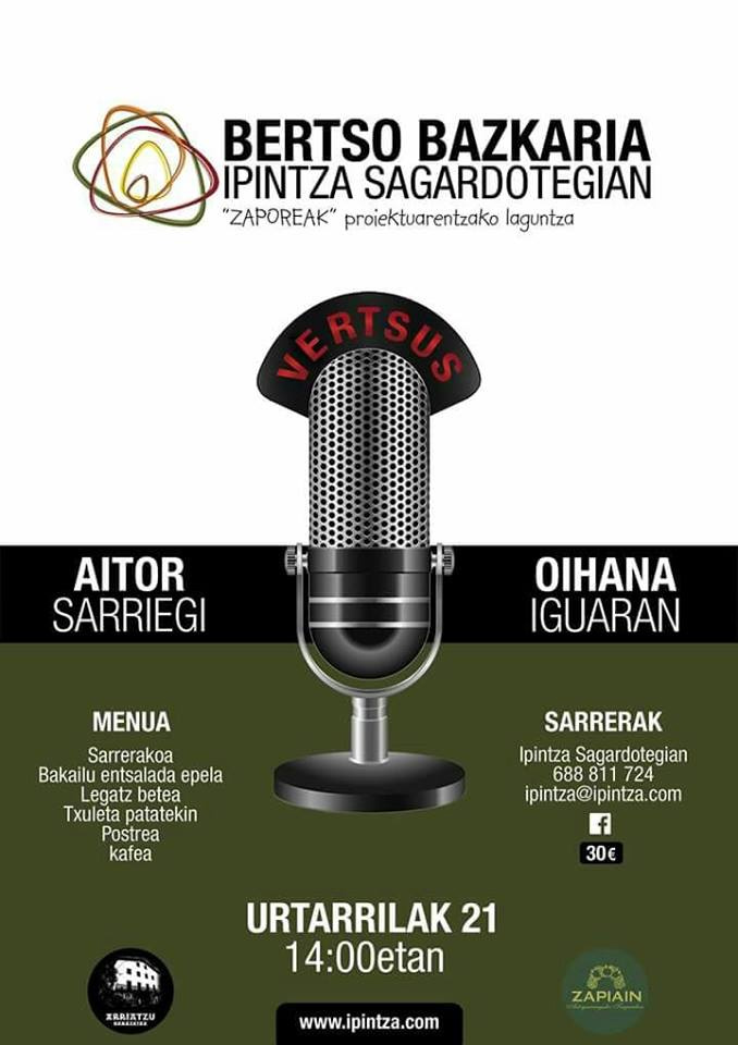 Bi bertsolari handi, Aitor Sarriegi eta Oihana Iguaran, eta menu bikaina gozatzeko.