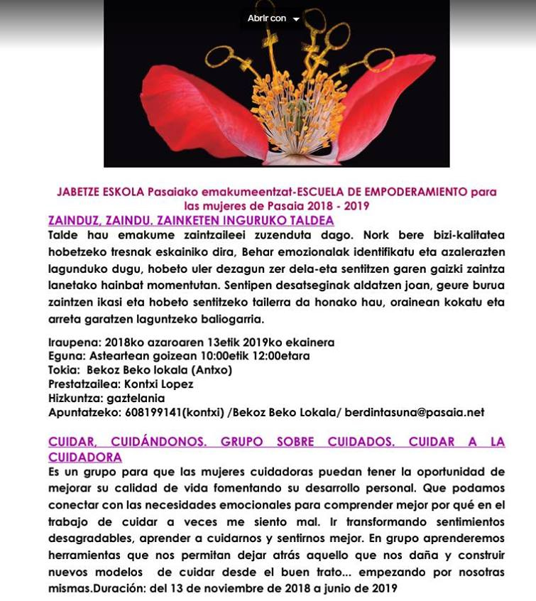 Escuela de Empoderamiento para las mujeres de Pasaia - Cuidar cuidandonos. Grupo sobre cuidados. Cuidar a la cuidadora
