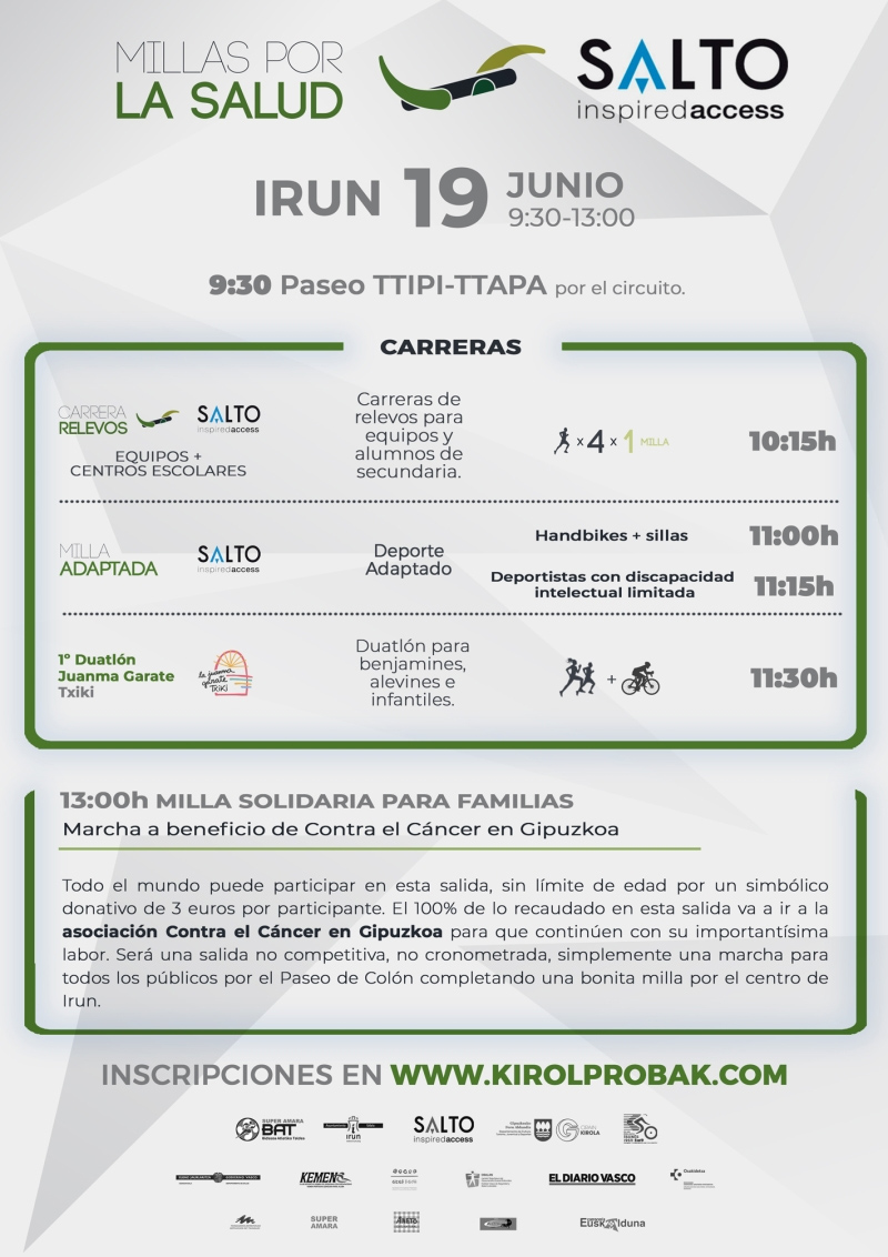 El club de atletismo Super Amara Bidasoa Atletiko Taldea, con la colaboración del Ayuntamiento de Irun, el apoyo la Diputación Foral de Gipuzkoa y el patrocinio de Salto InspiredAcces organiza el evento "Millas por la Salud Salto InspiredAcces".