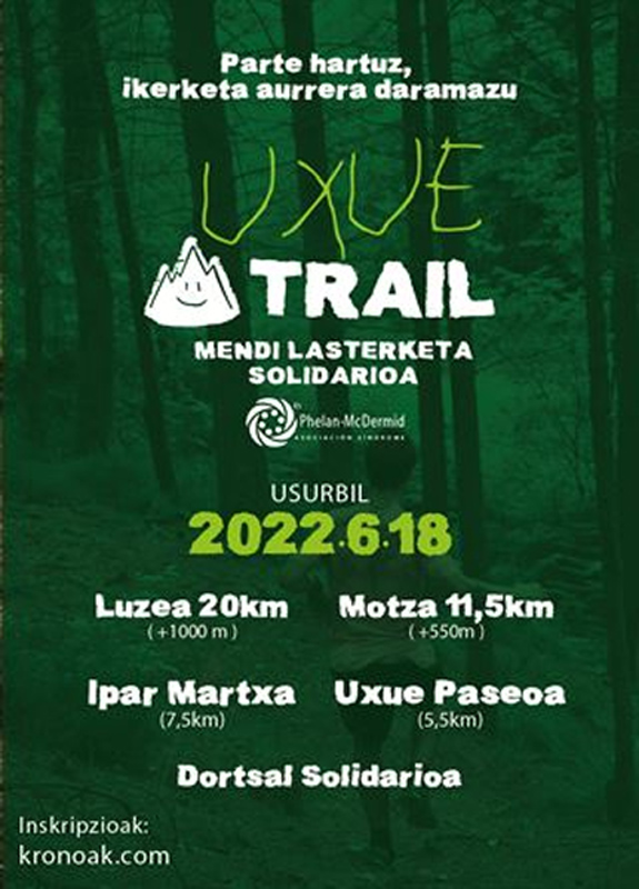 La carrera de montaña se celebrará por primera vez en Usurbil. La prueba popular que recorrerá los alrededores de Andatza el próximo 18 de junio ha sido bautizada por la organización como Uxue Trail, ya que será una iniciativa solidaria a favor de Uxue Martin, una jovencita con Síndrome de Phelan-McDermid. La inscripción ya está abierta.