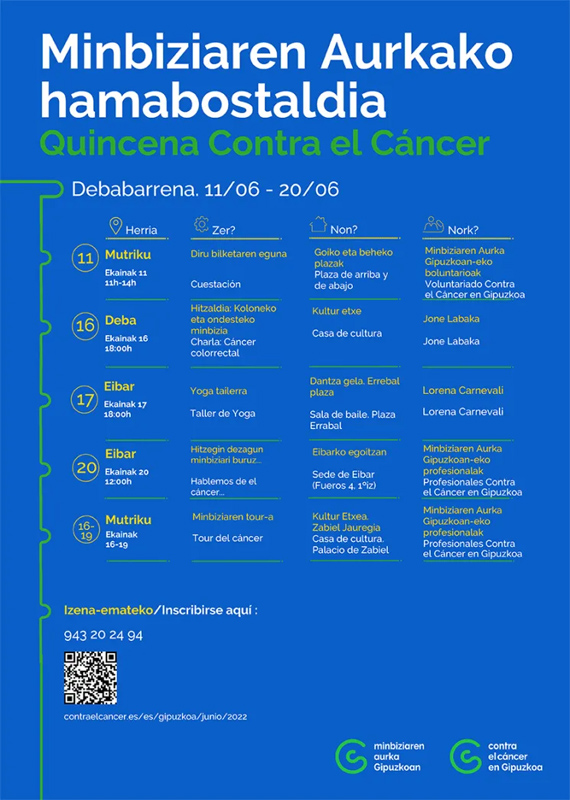 Minbiziaren Aurka Gipuzkoan-eko Debabarrenako Batzarrak Minbiziaren Aurkako Hamabostaldia jarriko du martxan zapatuan, ekainaren 11n, "herritarren artean laguntza gehiago lortzeko, paziente eta senideei ematen zaien arreta indartzeko eta minbizia duten biztanle gehiagorengana iritsi ahal izateko".