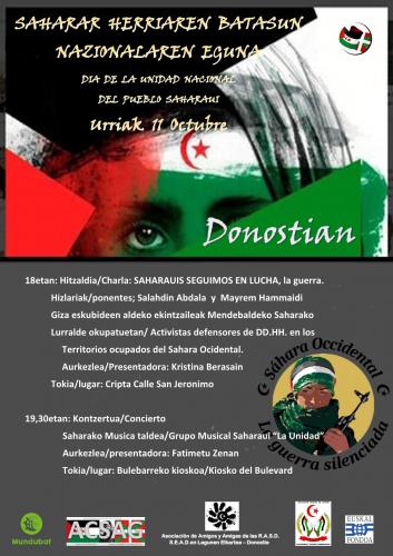 Urriaren 11n, asteartean, Saharar Herriaren Batasun Nazionalaren Eguna izango da, eta hainbat jarduera egingo dituzte Donostian, hiriko Saharako Lagunen Elkarteak beste eragile batzuekin batera antolatuta.
