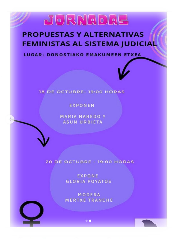 Hurrengo asteartean eta ostegunean 19:00etan Erasoen Aurkako Batzordea zure zain egongo dela gogoan izan, “Sistema judizialarekiko proposamen eta alternatiba feministak” izendatutako jardunaldiak elkarrekin burutu ditzagun.