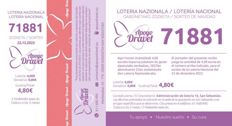 Gure loteria-zenbakiaren partizipazioak saltzen jarraitzen dugu. Oraindik garaiz zaudete zure lagun, senide, lankide eta, oro har, lagunekin eskuratzeko, oparitzeko edo trukatzeko. Badakigu hori egitean azaltzen diezuela Apoyodravet dela, Elkarteak epilepsia erregogorraren eta Draveten sindromearen arloan egiten duena, eta hain garrantzitsua delako parte hartze bakoitzeko 0,80 euroko dohaintza txiki horrekin laguntzea, Epilepsi