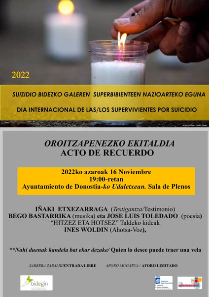 Suizidio Bidezko Galeren Superbibienteen Nazioarteko Egunaren inguruan Bidegin elkarteak Oroitzapeneko ekitaldia antolatu du.