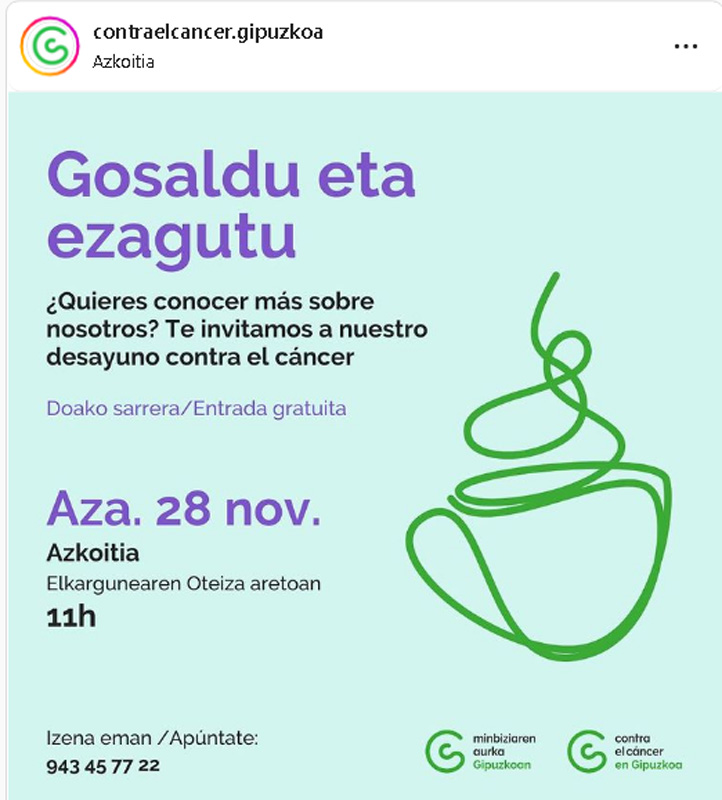 La asociación Contra el Cáncer en Gipuzkoa organiza una charla-desayuno con todas las personas interesadas de Azkoitia.