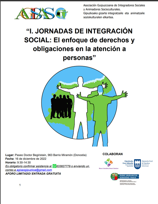 AGISAS Jardunaldia Donostian - Abenduaren 16 an Donostiako Miramón auzoan "GIZARTE INTEGRAZIOKO I.Jardunaldiak: Eskubide eta betebeharren ikuspegia pertsonekiko arretan" ospatuko dugu.