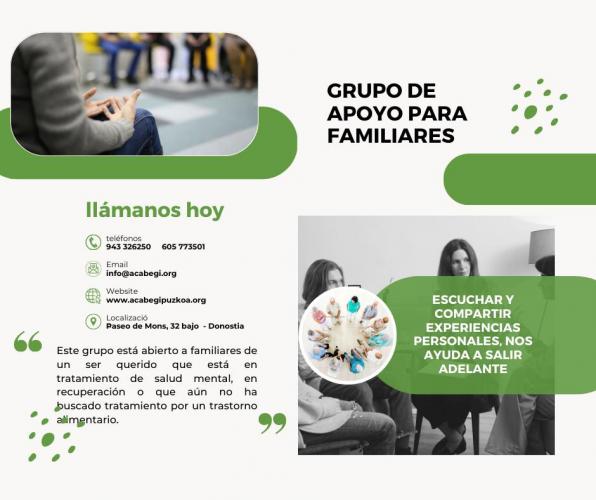 Elikadura nahasmenduak dituzten pertsonen familientzako sostengu taldeak berreskuratuko ditugu. Elikadura nahasmendu batetik berreskuratzen ari den pertsonen familiek onura ugari jaso dezakete sostengu taldeetan parte-hartuz, non sentimenduak partekatu eta egunerokotasunean sortzen diren arazoei aurre egiteko moduak ikasteko gune bat eskaintzen da.