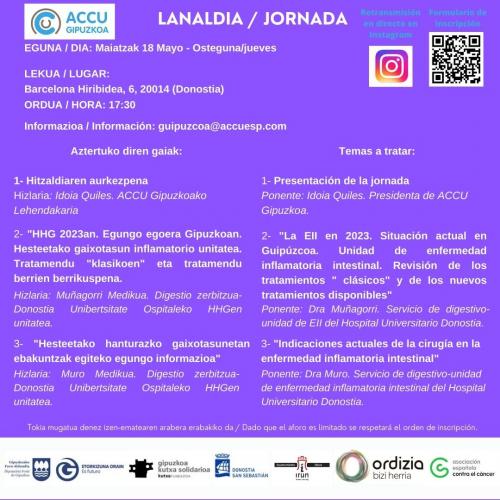 La Asociación de crohn y colitis ulcerosa de Gipuzkoa (ACCU), por el día mundial del EII, va a realizar una Jornada el jueves 18 de mayo, en la sede de la Asociación contra el Cáncer, en la que tendremos el placer de