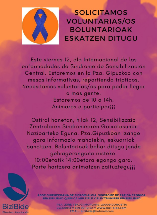 Este viernes 12 de mayo, dia Internacional de las Enfermedades de Sindrome de Sensibilización Central estaremos en la Plaza de Gipuzkoa con mesas informativas, repartiendo tripticos.